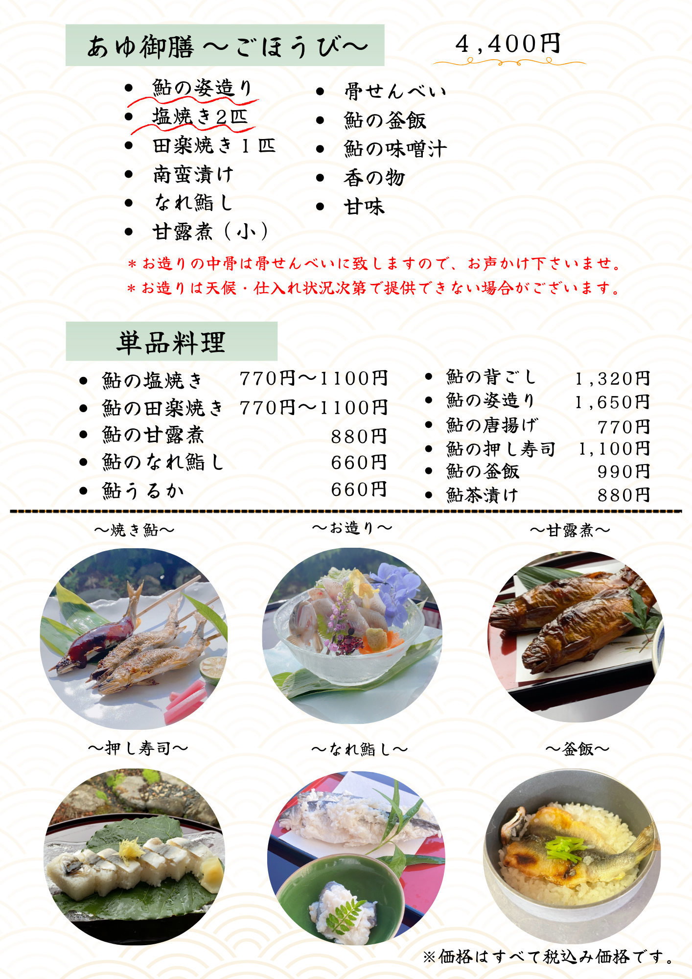 鮎は性質上、6月下旬〜7月の若鮎、8月〜9月の上り鮎、9月下旬〜10月の落鮎と